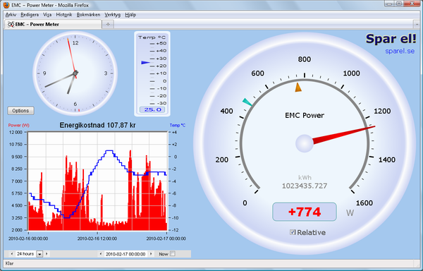 Spar pengar med hjälp av din elmätare och EMC-programmetEMC-programmet har en inbyggd webbserver som gör att du kan läsa av din elförbrukning via en webbläsare eller din mobiltelefon där du omedelbart kan se verkan av olika åtgärder. ![]() Har du också alldeles för hög elräkning?Med hjälp av EMC-programmet och Spar els detektor som monteras på elmätaren kan du ta reda på vad det beror på. Det grafiska diagrammet visar här dygnet den 16 februari 2010 som kostade 107,87 kr i energiförbrukning i den eluppvärmda villan. Vid kl 06:00 var utomhustemperaturen nere på -10°C och då gick det naturligtvis åt mycket el till elvärmen. Sedan gick det åt el till att värma varmvatten och laga frukost. När alla kommit iväg till skola och arbete sjönk effekten markant till att ligga runt 2700W under dagen. Strax innan 18:00 var det spisen som stod för dagens högsta effektuttag. Mellan 19:30 och 23:30 förbrukas mycket el trots att utomhustemperaturen som under dagen varit uppe i +1,0°C nu låg på mellan −2,5 och −3,0°C, en del av denna förbrukning kan troligen sparas in med enkla åtgärder. T.ex. kan du testa med att stänga av en apparat i taget för att se vad som drar onödigt mycket energi. | |